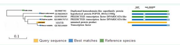 SMART blast shows that the MMYB gene has a conserved domain. The Chuan Sang, Populus trichocarpa, and Jinsixiaozao were the three best matches between MMYB and nonredundant protein sequences. The homologous genes have conserved SANT and myb_SHAQKYF domains. The MMYB gene (unknown protein) has a close relationship with Chuan Sang (Morus notabilis). The corresponding conserved domain transcription factor is the Chuan Sang. The other species that have a relationship is Arabidopsis, whose conserved domain is duplicated homeodomain-like superfamily protein (At2G38090), Populus trichocarpa, Jinsixiaozao, and soybean, are predicted and uncharacterized proteins.