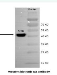 The recombinant plasmid pET-30a (+) - MMYB was transformed into an E. coli for the expression of MMYB after induction by IPTG for 3h; the recombinant protein of the MMYB was highly and effectively expressed in E. coli Rosetta gami. The protein (MMYB) has a molecular weight of 41.7 kDa and a (PI) of 7.61, consistent with the predicted molecular weight and PI using bioinformatics and detected by SDS-PAGE analysis. The recombinant protein induced by the IPTG was transferred into the PVDF membrane after SDS-PAGE separation and was detected by western blot using mouse anti-6His Tag primary antibody. As depicts in Figure 3, the protein band was clearly defined by western blot and estimated to be 41.7 kDa of molecular weight.