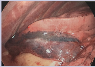 Fiberoptic bronchoscopy revealed streaks of blood in the left main bronchus. Fresh blood and blood clot was found in the inferior lingular segment of the left upper lobe. Broncho-alveolar lavage was performed in the left upper lobe inferior lingular segment and the return was bloody. Broncho-alveolar lavage specimens were sent for microbiology and cytology and were negative for infection and malignancy. Given the findings of active persistent bleed, 3-D and MIP reconstructions were done from the prior CT Chest which did not show any bronchial artery branches or parasitized intercostal artery branches supplying the lingular consolidation. There were only normal sized pulmonary arteries and veins supply the inferior segmental lingular consolidation. It was deemed by Interventional Radiology that the vessels are not amenable for embolization, given the lack of classic features of pulmonary arterio-venous malformation. Thoracic Surgery was consulted for resection of the lingula. Patient underwent video assisted thoracoscopic surgery and was found to have marked discoloration of the lingula [Figure 3] and wedge resection of the lingula was performed.