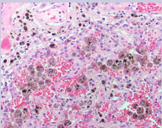 Figure 5: Significant hemosiderin deposition within alveolar macrophages and the interstitium (200x). Hemosiderin deposition would not be expected if these collections of blood were an artifact of the surgical resection. There is no evidence of vasculitis or capillaritis