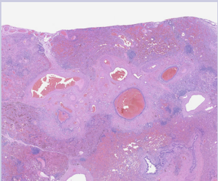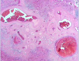 Figure 4: An abnormal collection of blood vessels with various sizes in the subpleural lung parenchyma (20x). Prominent collections of hemorrhage are seen in surrounding alveolar airspaces and distended bronchioles.