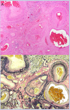 Figure 7: A) Higher power view of the abnormal vascular malformation containing various blood vessels (40x). Rare small veins (center) contained multiple vascular lumens and other features suggestive of recurrent thrombosis and recanalization. B) Elastic Van Gieson (EVG) stain (40x).