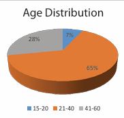 Figure 1 Age Distribution. 65% of the patients were between the 21-40 years of age, followed by 28% belonging to 41-60 years of age and 7% belonging to 15-20 years of age.