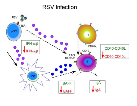 RSV: Respiratory Syncytial Virus; DC: Dendritic Cells; pDC: plasmacitoyd Dendritic Cells; IgA: Immunoglobulin A; BAFF: B Cell Activating Factor; BAFF-R: B Cell Activating Factor-Receptor; IFN: Interferon.
