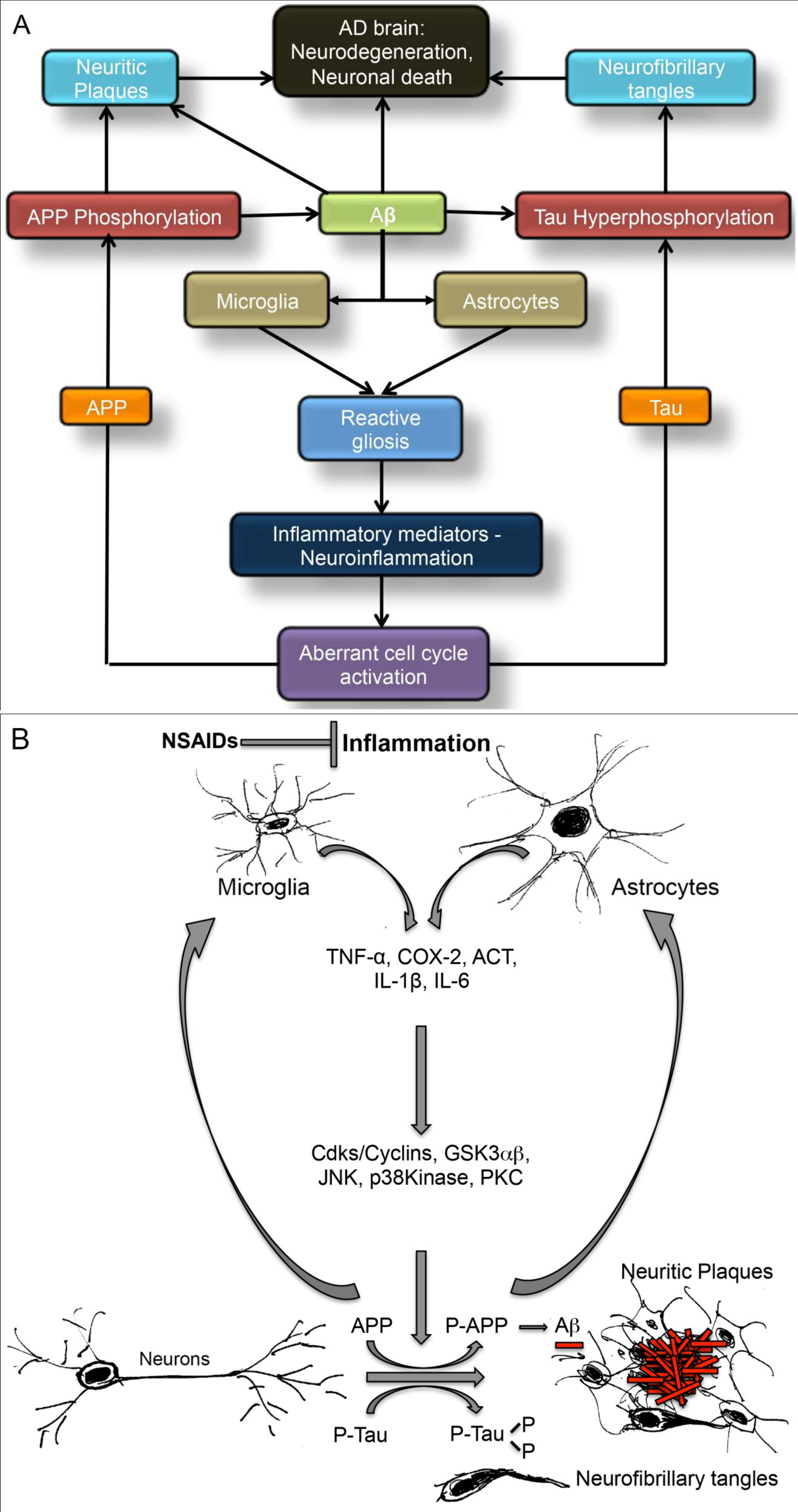 Figure 1 (A) The pathological cascade in Alzheimer’s disease. Oligomeric Aβ in AD induces activation of glia and release of inflammatory mediators. The expression of cell cycle proteins in compromised neuronal populations coincides with this neuroinflammatory response. Aberrant cell cycle activation in the AD brain has been shown to result in pathological modifications in the AD-associated proteins, APP and Tau. Hyperphosphorylation of APP results in increased production of the pathogenic Aβ peptide and its subsequent deposition in the brain. Soluble Aβ has been shown to further induce Tau hyperphosphorylation, neurofibrillary tangle formation, neurodegeneration and cell death. (B) Schematic of the inflammation and cell cycle-dependent signaling in Alzheimer’s disease: Amyloidogenic processing of APP leads to the production of the neurotoxic Aβ peptide. Reduced clearance and Aβ aggregation leads to glial activation and subsequent production of proinflammatory cytokines and chemokines, which can enhance expression of cell cycle regulatory proteins in the AD brain. In particular, TNF-α and COX-2 have been shown to correlate with expression of cell cycle markers. TNF-α is thought to initiate cell cycle events through the activation of the JNK pathway. Chronic exposure of neurons to inflammatory mediators thus lead to accelerated neuritic plaque and neurofibrillary tangle formation in AD brain. Inhibition of inflammation could potentially prevent aberrant cell cycle signaling and neurodegeneration associated with AD.
