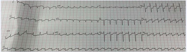 On days +3 or 120 hours after the last dose of Cy, the patient developed hypotensive shock, cold extremities and short of breath. Resuscitative fluid therapy and high dose of norepinephrine failed to alleviate these symptoms, and tachycardia, fever and syncope quickly followed. Syncope was considered to be brought on by reduced blood flow to the brain due to shock and fever. At 16:00 on August 10, the patient was admitted to Hematological intensive care unit (HCU) for aggressive vital support. The patient regained consciousness gradually. However, her condition deteriorated with unstable vital signs: listless, body temperature around 38.2?, electrocardiogram monitoring showed blood pressure 64/36 mmHg, heart rate 140 to 150 bpm, respiratory rate 30 to 35 bpm, and peripheral oxygen saturation (SPO2) 98% to 100%. The arterial blood gas analysis indicated tissue hypoperfusion deteriorated within a few hours from HCU admission: lactic acid increased from 2.5 to 9.1 mmol/L, BE decreased from -1.1 to -9.6 mmol/L, and the pH dropped to 7.33. The blood routine test revealed a reduction of complete blood cell count and neutrophil deficiency post-HSCT. Clinical laboratory tests indicated elevated Inflammatory markers: IL-6>5000 pg/ ml, procalcitonin (PCT) was 0.61 ng/ml; and multiorgan dysfunction: alanine aminotransferase (ALT) was 91.8 U/L, total bilirubin (TBIL) was 122 umol/L, creatinine was 82 umol/L. The severity of the myocardial injury was noteworthy: cardiac troponin I (cTn-I) was 3489 pg/ mL, serum N-terminal pro-brain natriuretic peptide (NT proBNP) >35000pg/ml. ST-segment depression was found in leads II and V3-V6 on electrocardiography (Figure 1).