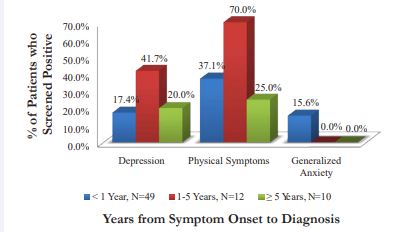 Preliminary data indicates that rates of depression (21.7%) and anxiety (10.4%) were more frequent in the FMD population when compared to the general population (6.7% and 3.1% respectively) [8,9]. Neither the number of vascular beds affected nor the location(s) of the affected bed(s) had any influence on psychological symptoms. However, symptoms seemed to be exacerbated by diagnostic delays. Patients who had a delay to FMD diagnosis of 1 to 5 years had a higher incidence of depressive and somatoform symptoms (Figure 1). Further, patients diagnosed with FMD of the head or neck and patients who had experienced an FMD-related event (stroke, TIA, MI, aneurysm, dissection, subarachnoid hemorrhage, renal infarction, mesenteric ischemia) had higher rates of somatoform symptoms [5]. Yet, these preliminary findings do suggest that symptoms of depression and anxiety, and somatoform symptoms are greatest in the first three years after diagnosis and appear to lessen over time (Figure 2).
