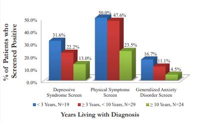 Figure 2 Rates of depressive syndrome, physical symptoms, and generalized anxiety by length of time post-FMD diagnosis.