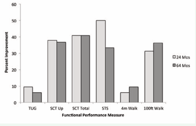 Figure 1: Percent improvement in functional performance measures after 24 and 64 months of ERT. Percent change calculated from pre treatment values. TUG, timed up-and-go; SCT, stair-climbing test; STS, sit-to-stand test; reps, repetitions in 30 seconds.