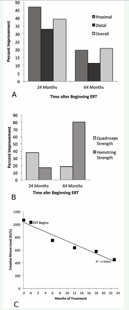 Manual Muscle Testing and Functional Evaluation: The patient underwent a full evaluation including manual muscle testing and functional performance just before beginning ERT (September 2010), in October 2012, and again in February 2015. The same trained physical therapist (JS-L) performed all measurements and collected all data.