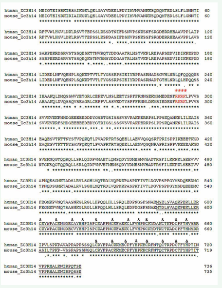 Figure 1: Sequence alignment between the human and mouse ZC3H14 proteins: The long form of human and mouse ZC3H14 have 89.7% identities in amino acid sequences. The predicted nuclear localization signal sequences, 292-RKRK, are well conserved (red colored and with “#” above them. The sequences of CCCH(5) domain are underlined and the CCCH core amino acids are labeled with “&” above them.
