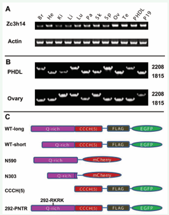 Figure 2: Expression pattern, and constructs design of mouse Zc3h14 gene. (A) RT-PCR analysis. Zc3h14 is expressed in all the tissues and cell lines that having been detected (Br, Brain; He, Heart; Kidey, Ki; Li, Liver; Lu, Lung; Pa, Pancreas; Sk, Skin; Sp, Spleen; Ov, Ovary; Te, Testis; PHDL, pancreatic PNA-HSA double-low epithelial cells; P19, P19 embryonal carcinoma cells). Zc3h14 is highly expressed in ovary and testis. (B) Two transcript isoforms are found in ovary and PHDL cells. The two transcript isoforms have similar expression levels in PHDL cells and ovary. (C) Constructs have been designed for localization, biochemistry and functional studies. (WT: wild type; N590 and N303: N-terminus that including the first 590 or 303 AAs of the long form, respectively; CCCH(5): the five CCCH zinc fingers; 292-PNTR: the 292-RKRK sequences are mutated to 292-PNTR).