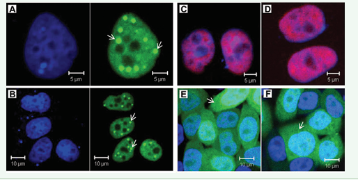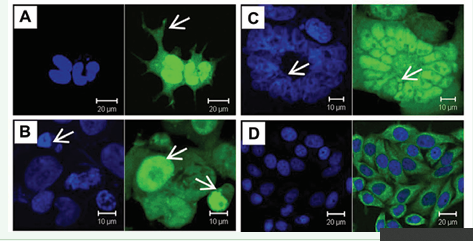 Figure 5:Morphological abnormalities were induced by over-expression of the CCCH(5) domain in PHDL cells. (A) Most cells lost the polygonal epithelial characteristics and grew out long processes (arrow). (B) Multiple nuclei were easily found. One typical cell contained tens of nuclei. Some of the nuclei were fragmented (arrow). (C) Round-shaped cells were easily found (arrows). (D) PHDL cells in the control group showed typical polygonal morphology. (green: EGFP; blue: DAPI).