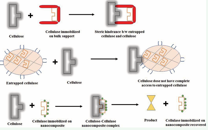 Indeed, the demand for these enzymes is more rapidly growing than ever before, that has focused to the research on stable and reusable cellulolytic enzymes. With the opening of new avenues in biotechnology, the application of cellulolytic enzymes has increased into several other fields such as environmental and analytical chemistry [15,16]. In order to produce soluble sugars from cellulose, cellulolytic enzymes from varying sources such as microbial, plant, insects and recombinant organism have extensively been obtained. The use of cellulolytic enzymes in cellulose based industries has been prevalent since last several decades but the use of soluble enzymes, limits their applications due to certain inherent problems such as high cost, low stability, poor reusability and difficulty of their use in continuous reactors. Therefore, alternative technology is required for economizing system and using enzymes at large scale; enzyme immobilization is a preferred technology to apply enzymes at industrial level in batch processes as well as in continuous reactors [17,18]. Since the advent of enzyme immobilization technology, a large number of methods have been developed to immobilize cellulolytic and other enzymes and many of them have successfully been applied at commercial level [19]. Moreover, the immobilization of cellulolytic enzymes on the surface of bulk support via adsorption or covalent attachment or by entrapment is not suitable particularly for cellulases, a major enzyme required for cellulose hydrolysis. The substrate for cellulase is insoluble and very large macromolecule, and thus it creates steric hindrances in the binding with the active site of enzyme. There are also some more demerits of traditional immobilization of cellulases such as poor yield of immobilization in case of surface binding and problem of accessibility of substrate for entrapped and microencapsulated enzymes [20,21]. Figure 2 represents steric hindrances between active site of cellulase bound to bulk and nanosupport and cellulose substrate. The separation of immobilized enzyme from reaction medium is also problematic due to insoluble nature of substrate, cellulose.