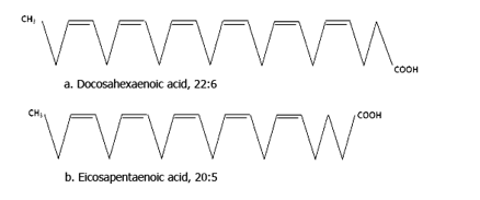 Figure 1: Structure of two common omega 3 fatty acids; docosahexaenoic acid (a) and Eicosapentaenoic acid (b).