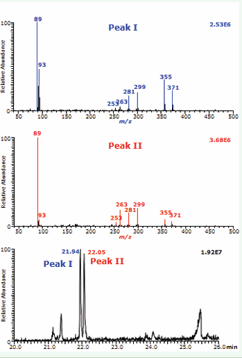 Figure 1: GC-MS/MS analysis of reaction products formed from the reaction of cis-d2-oleic acid (100 µM) and synthetic peroxynitrite (4 mM) in human hemolysate at 37 °C after a 20-min incubation. Product ion mass spectra obtained from CID of m/z 461 of the PFB-TMS derivatives of peak I (upper panel), peak II (middle panel) which were separated by GC (lower panel). Blood was donated by the author.