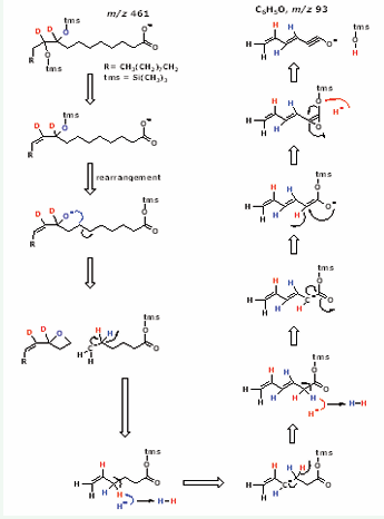 Results: The expected anion for dihydroxy-[9,10-2H2]stearic acids [M – PFB]– with mass-to-charge ratio (m/z) of 461 was subjected to collision-induced dissociation. We observed two closely eluting, baseline-separated GC peaks of comparable size with the retention times of the PFB-TMS derivatives of synthetic threo- and erythro-9,10-dihydroxy-stearic acids. The product ion mass spectra obtained from both GC peaks were virtually identical and contained the anions m/z 371, 355, 299, 281, 263, 93, and 89. Except for m/z 89 ([TMSO]–) and 93 ([C6H5O]–), all other mass fragments were by 2 Da larger than of synthetic unlabelled threo- and erythro-9,10-dihydroxy-stearic acids, indicating the presence of two deuterium atoms in the fatty acid skeleton at C-9 and C-10. The underlying mechanism is likely to involve addition of the peroxy group of peroxynitrite on the 9,10-double bond of oleic acid. A mechanism is proposed for the formation of the product ion m/z 93 from m/z 461.