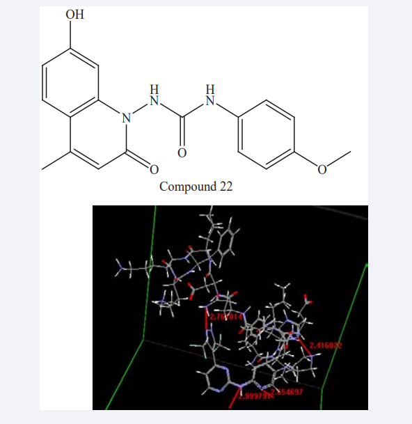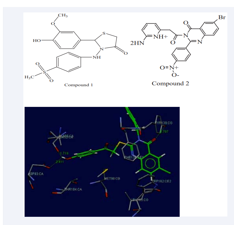 Suby T Baby et al have reported that human Heat Shock Protein 90(Hsp90) was involved in many signaling networks associated with cancer progression, so it is an important target for cancer therapeutics. Therefore, they recognized potential lead molecule among the selected heterocyclic compounds against Hsp90 (PDB: 1YET) through MD (GOLD 3.1). A primary objective in MD was the ability to estimate the scoring function and evaluate protein– ligand interactions in order to predict the binding affinity and activity of the ligand molecule. By using a genetic algorithm method to explore the conformational space of the ligands and it give some flexibility of active site residues. Docking calculations were performed using the default GOLD fitness function and their parameters were used to produce the set of optimal conformations of both the ligand and the protein. Greater the GOLD fitness score better the binding affinity. A Pharmacophore study (Discovery studio 2.1) was carried out to construct a hypothetical pharmacophore model aiming to study fitting of the designed compounds to the generated pharmacophores of our target protein Human Hsp90. To build the pharmacophore model for screening, corresponding possible interaction points from active site of Human Hsp90 protein was generated using the ‘Interaction Generation’ protocol implemented in Discovery Studio. It extracted all the available hydrophilic and lipophilic interaction points that can be complemented by the inhibitor. Compounds were ranked based on fit values. A higher fit value represents a better fit. On these basis compounds are analyzed and results of docking and pharmacophore showed that the binding affinity and good fit values of Compound 1 and Compound 2 with our target protein was reliable, showing significant interactions, suggesting their inhibitory activity as shown in Figure (1).