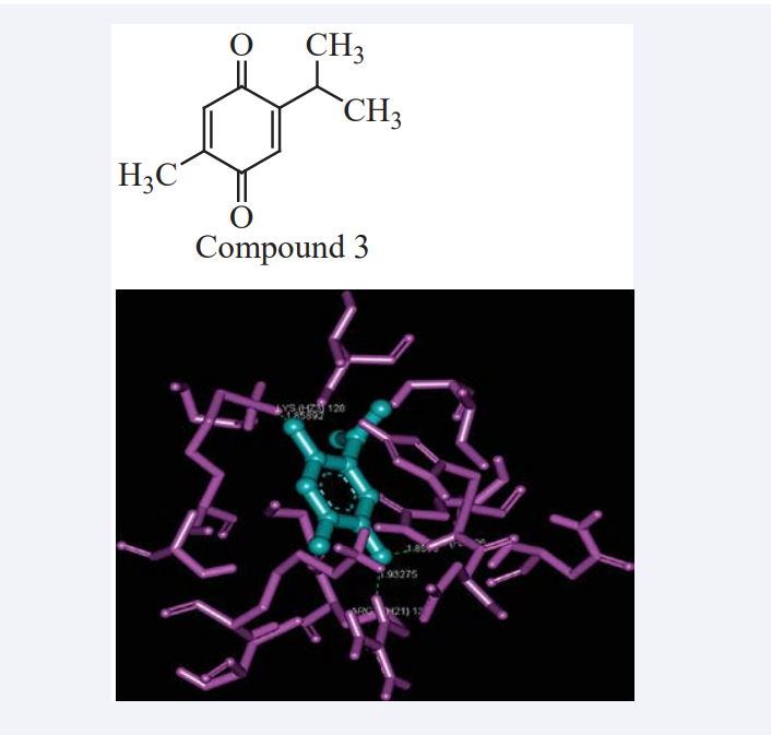 By correlating pharmacophore results with the docking result signifying that both these compounds show antagonistic activity or potential inhibitor of HSP90 [17]. Gajendran nithya et al., have explained the statistics on cancer imposes the urge to extend new methods to control this deadly form of the disease. The Phosphatase and tensin homolog located on chromosome 10q23 (PTEN) is inactivated in a subset and AKT is frequently activated in cancer. The PTEN is the central negative regulator of the phosphatidylinositol 3-kinase (PI3K)/ AKT signaling cascade that influences multiple cellular functions including cell growth, survival, proliferation and migration in a context-dependent manner. Dys-regulation of this signaling pathway contributes to different types of cancers. In that they explore the anti-cancer potential of Thymoquinone (TQ) by analyzing the interaction between TQ with the target protein PTEN. The 3D structure of TQ is designed using in-silico methods and the structure of PTEN is obtained from National Center for Biotechnology Information (NCBI). TQ showed the binding energy of −7.37 Kcal/mol against PTEN with three hydrogen bonds as shown in Figure (2).