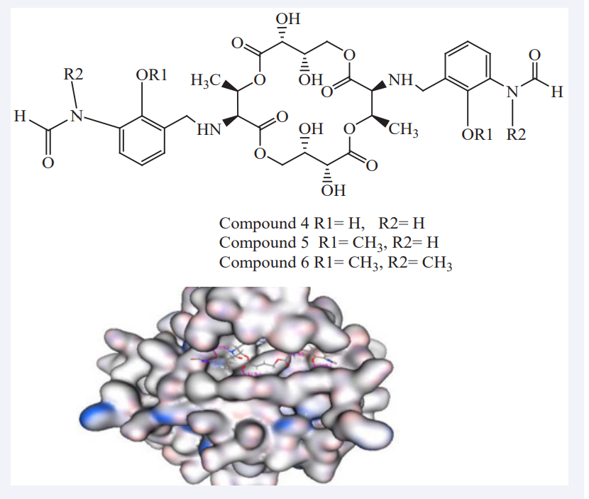 The five top-ranked compounds with their docking score (London DG) namely, Compounds 4,5 and 6, which have a lower ?G binding energy, better affinity and stronger hydrogen bonding interactions to the active site of Bcl-2 than antimycin A3. The analogue compounds, which have an 18-membered tetraol core exhibited the strongest hydrogen bond interaction, formed high stability conformation, and demonstrated the greatest inhibitory activity on the catalytic site of Bcl-2 breast cancer compared to the original antimycin A3 [19].