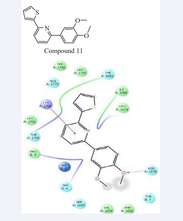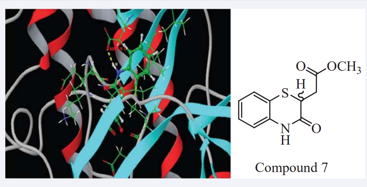 Mohan jayapriya et al., have studied a series of benzothiazine compounds for ADME (QuickPro) properties to assess their drug-like properties. These compounds were selected for MD (Glide software) studies as PIM1 kinase inhibitors. Compound 7 showed a Glide score of −7.622 kcal/mol with good hydrophobic and hydrophilic interactions with PIM1 kinase proteins as shown in Figure (4) and appear to be more potent.