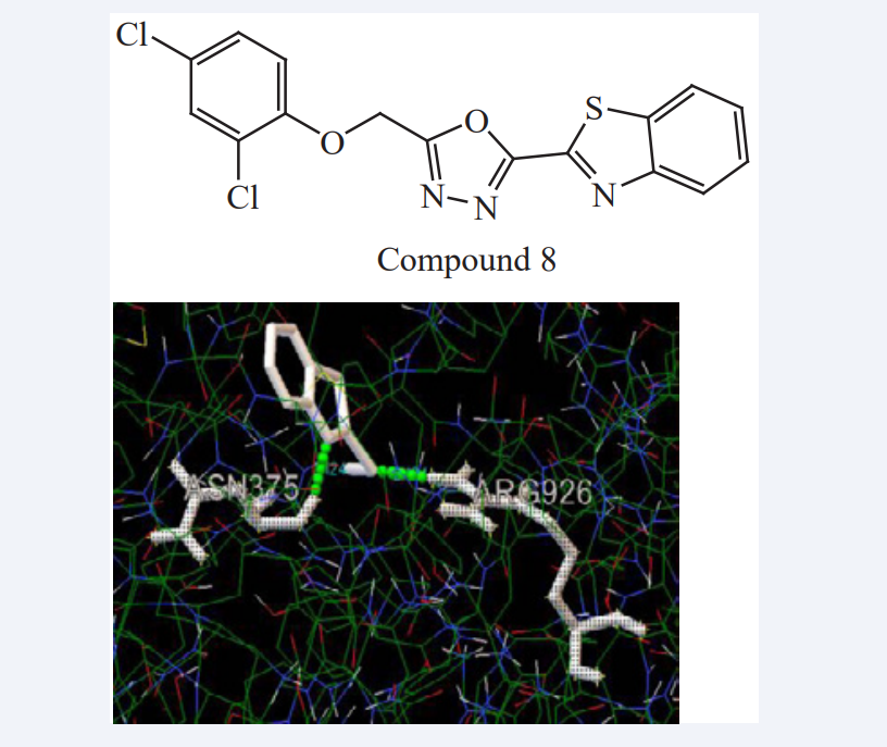 The analogues of benzothiazole at second position showed good receptor binding with the selected targets. Substitution on 5th position of oxadiazole ring with aromatic group also increases the activity. Introduction of an ethylene bridge between oxadiazole and aromatic substitution resulted in an analogue with best binding potency. The final assessment of drug-likeness and its related parameters helps to confirm the oral activity of compounds [21].