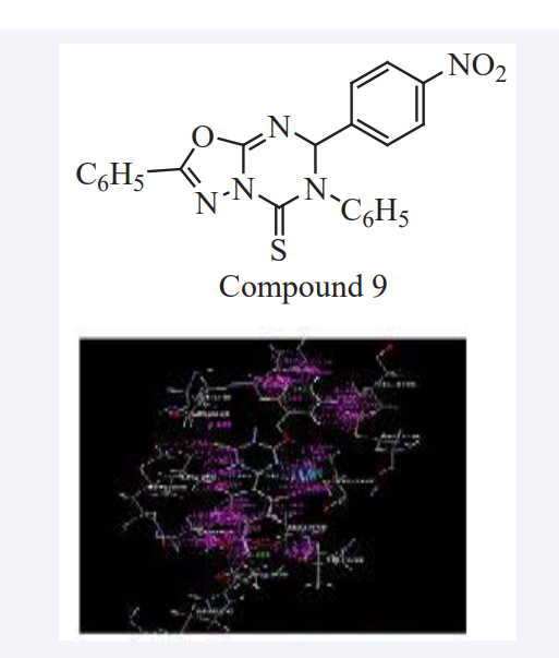 Deepak Kumar Basedia et al have reported a series of compounds 1,3,4-oxadiazolo-[3,2-a]-1,3,5-triazine and 1,3,4-thiadiazolo-[3,2-a]-1,3,5-triazine derivatives which were successfully synthesized and their structures were confirmed by spectral analysis (IR, NMR & Mass). MD (V-Life MDS) of title compounds were done on breast cancer protein BRCA1 (PDB: 2IOK) and their protein receptor interaction study has carried out to identify potential anticancer compound based on dock score. The Compound 9 show promising dock value -70.24. Compound bind with protein BRCA1 (PDB: 2IOK) by forming hydrogen bond interaction, hydrophobic interaction with amino acid residues as shown in (Figure 6). To strengthen the current investigation, further evidences both in vitro and in vivo are needed so as to use this approach effectively for cancer treatment [22].