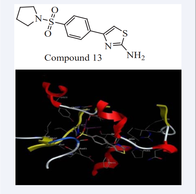 Mahmoud Sayed Bashandy has described the synthesis of some novel sulfonamides having the biologically active, thiazole, imidazo[1,2-a]pyridine, imidazo[2,1-c] [1,2,4] triazole, imidazo[2,1-b]thiazole, nicotinonitrile, 1,3,4-thiadiazine, quinoxaline and 1,4-thiazine moieties, in this 1-(4-(pyrrolidin-1-ylsulfonyl)phenyl)ethanone used as a starting material [27]. Molecular Operating Environment (MOE) as the computational software, it performed virtual screening using MD studies of the synthesized compounds. All the minimizations were performed with MOE until a root mean square deviation (RMSD) gradient of 0.05 K Cal/mol?Å with MMFF94X force field [28]. The results indicated that some synthesized compounds are suitable inhibitors against dihydrofolate reductase (DHFR) enzyme (PDB ID: 4DFR) with further modification. MD studies further help in understanding the mode of action of the compounds through their various interactions with the active sites of DHFR as shown in (Figure 10), identical charges were automatically calculated. Compounds were tested in-vitro antihuman liver hepatocellular carcinoma cell line (HepG2) exhibited better activity than methotrexate as a reference drug [29].