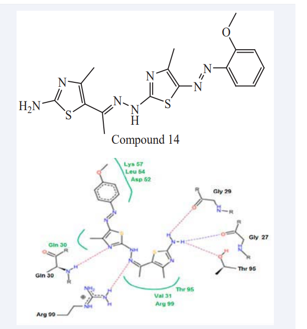 Sobhi M. Gomha et al have reported reactions of ethylidene thio carbohydrazide with hydrazonoyl halides gave 1,3-thiazole or 1,3,4-thiadiazole derivatives. The cytotoxic activity of the selected products against the Hepatic carcinoma cell line (Hepg-2) was determined by MTT assay. The cytotoxic effect was due to its inhibitory effect to the inner mitochondrial membrane lactate dehydrogenase enzyme (LDH-5), which, in turn, decreases cellular activity, including the rate of cell division. It has been reported that LDH-5 has an important role in tumor maintenance in many human cancers like the hepatic cancer [31] which confirms that LDH-5 inhibition is a good target for developing anticancer agents. The binding mode of the active compounds was interpreted by a MD (Leadit 2.1.5). They were performed this study to interpret the LDH inhibitory activity for the synthesized compounds that were confirmed biologically. A direct correlation between the activity and the binding affinity was observed also the entropy ligand conformation score for the highly active group was a neglected value (0.00), which is favored for best fitting. The MD study confirmed high binding affinities of –24.85, –kcal/mol for Compounds 14. Thiazol-2-(3H) moiety was important to form a hydrogen bond with Thr 99, Asn 113 and Ala 96 as mentioned in (Figure 11). The N=N and C=N groups were involved in the interactions. An overall good fitting and placement was observed for the docked compounds inside the active site where the nicotinamide-adenine dinucleotide was bound [30].