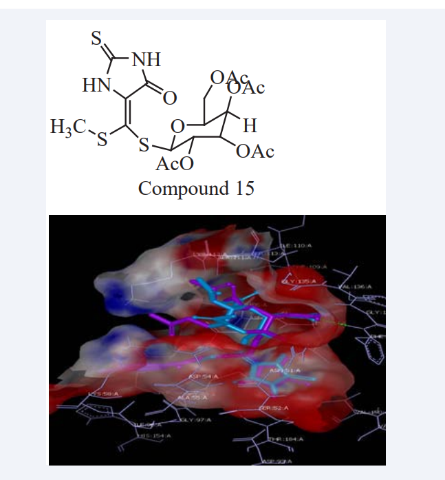 Elgemeie GH et al have synthesized a novel series of 2-thioxoimidazolidin-4-one and Benzothiazole thioglycosides via one-pot reaction. The cytotoxic activity of compounds were evaluated against MCF-7 cell lines (Breast carcinoma cell lines) showing high to moderate anti-tumor activities moreover MM of these compounds revealed that they have high binding affinity through hydrophobic-hydrophobic interaction and moderate selectivity through the hydrogen bond interaction with the atypical nucleotide binding pocket in the amino terminus of HSP90 as shown in (Figure 12). After MD result it confirmed that Compound 15 has Consensus Score 431 and Novobiocine have a Consensus Score 538, hence it could be potential drug candidates for cancer treatment [31].
