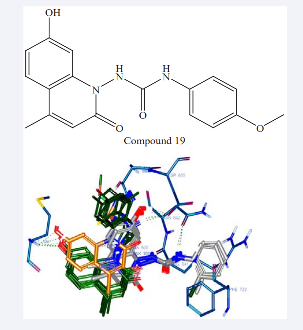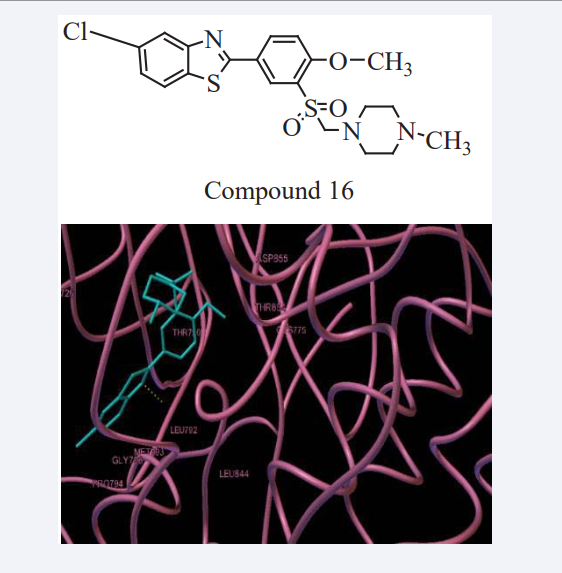 Mohamed Jawed Ahsan et al have synthesized a series of new quinoline analogues in two steps. The Compound 19 showed maximum docking score and maximum anticancer activity with GI50 of 35.1μM against HeLa (cervix cancer cell line) and 60.4 μM against MDA-MB-435 (breast cancer cell line) respectively. A MD study implying EGFR-TK was carried out to observe the binding mode of new quinoline analogues on the active site of EGFR-TK. The amino acid residues Met793 showed backbone H-bonding with the hydroxyl group, while Asp855 showed side chain H-bonding with aryl NH group as shown in Figure 17. This compound could be considered as lead for further optimization and drug discovery. The quinoline derivatives discovered in this study may provide valuable information in the field of drug design and cancer therapy [35].