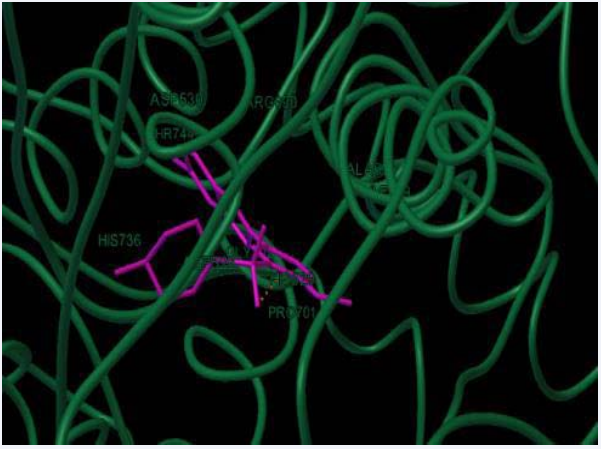 Ayyappan Aravind et al have focused on the SBDD and development of novel Acetidino-quinazoline derivatives and their antiproliferative evaluation. The compound that inhibits the epidermal growth factor receptor (EGFR), a tyrosine kinase receptors are directly related to blockade of regulatory processes of cellular proliferation hence it is suitable targets for cancer treatment. They were carried out In-silico design (ACD labs ChemSketch 12.0) and analyze ‘Lipinski Rule of Five’ and drug likeness properties (Molinspiration) of novel analogues. Biological activity was predicted by PASS software. After in-silico design all the proposed derivatives were subjected to flexible docking on to the binding pocket of EGFR (Pdb ID: 1M17) using GLIDE program of Schrodinger as shown in Figure (7).