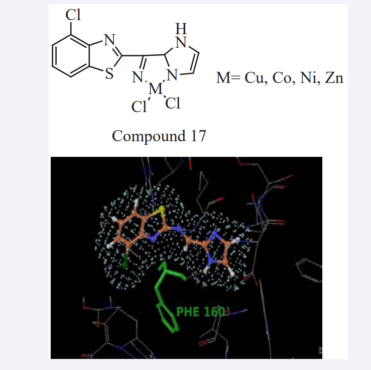 Jagadish Tota et al., have presented work, in that a new Schiff base ligand and its metal complexes were synthesized, such compounds were analyzed through various spectral techniques. The analytical data has shown the metal to ligand ratio is 1:1. IR spectral studies revealed that binding sites of ligand with metal ions through the azomethine nitrogen and imidazole nitrogen atoms. The core intension of the present work is to check the biological activities of the compounds. All the compounds were screened against bacterial strains and HeLa, MCF-7 cancer cell lines. Metal complexes have shown good antibacterial activity than ligand, but in case of anticancer activity both Schiff base ligand and its metal complexes have shown greater activity. The binding mode of the ligand with protein active sites were predicted using MD technique. Interaction of docked pose of ligand in the protein active site showing hydrogen bond interactions with PHE1 60 as shown in (Figure 15). The dock score values of ligand showed a correlation with the inhibitory activity against Staphylococcus aureus pencillin binding protein 4, E. Coli Penicillin Binding Protein 4 (dacB) and Homo sapiens cyclin dependent kinase [33].