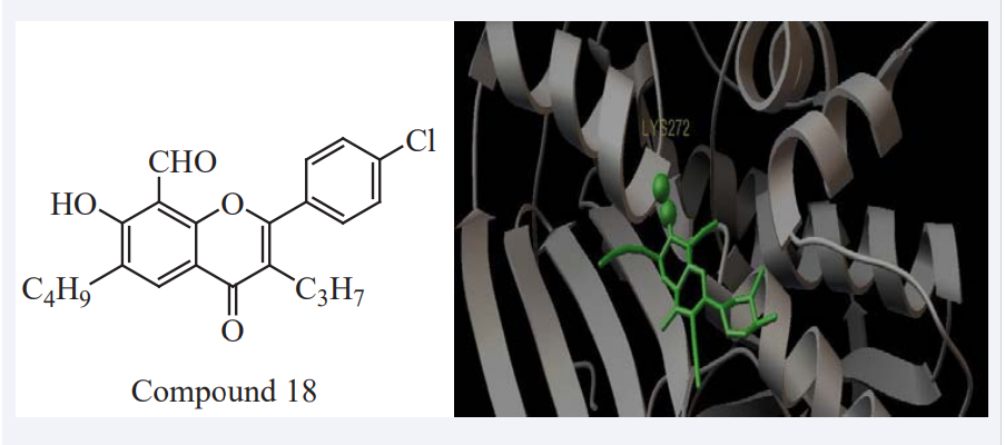 M. Yaseen Mowlana et al have reported according to Claisen-Schmidt condensation a series of novel substituted Indolyl Chalcone derivatives were synthesized and characterized by TLC, elemental analysis, IR and 1H and 13C NMR spectroscopy and evaluated docking study [24] that were subsequently screened for activity against bacterial and fungal strain. In that the docking study involves protein along with the BRCA1 receptor, in that one hydrogen bond proves to be a most stable complex inhibiting the activity of integrase as shown in Figure (8). For evaluating accuracy of docking, the binding energy and numbers in cluster was used. The interaction shows that it binds to the protein and specifically interferes with its strand transfer activity [25].