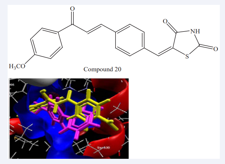 Metta Madhuri et al., have studied the ligand-protein MD (Molegro Virtual Docker v 5.0.) simulation was used to preliminarily investigation and to confirm the potential molecular target for the thiazolidinediones compounds with observed cytotoxicity. The analysis of the best docked ligands against selected anticancer drug target revealed the binding mode of compounds involved in this study and confirm the role as EGFR inhibitors. Binding energies of the drug–enzyme (receptor) interactions are important to describe how fit the drug binds to the target macromolecule. The residues participated in the hydrogen bond formation within the active binding site region revealed the importance of these residues towards the observed binding energy with respect to the hit identified against EGFR target protein as mention in Figure 18. The obtained hypothesis could be the remarkable starting point to develop some new leads as potential EGFR inhibitors with enhance the affinity as well as intrinsic activity. The results of this work indicate efficient computational tools are capable of identify potential ligand such as Compound 20 which was earlier reported in our work as potential cytotoxic agent [36].