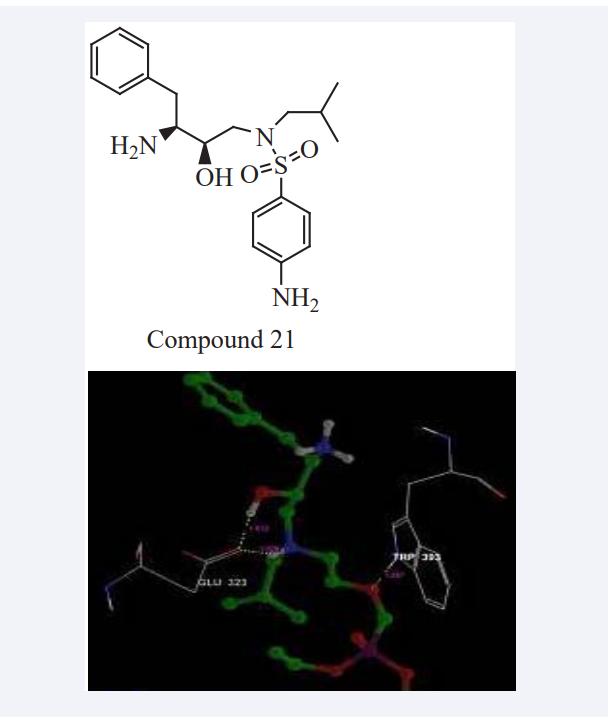 Matcha Bhaskar et al., have reported Darunavir is a synthetic non peptidic protease inhibitor which has been tested for anticancer properties. These analogues act by obstructing the activity of other signaling pathways which are implicated in many tumors. QikProp result state that all the analogues show specified range of all the pharmacokinetic properties required to become the successful drug. MD study was performed to test its anticancer activity against the biomarkers of the five main types of cancers i.e. bone, brain, and breast, colon and skin cancer. They have interacted to all the five biomarkers with sufficient selectivity, specificity and reflected the optimum binding energy to form the stable docked complex. In that the binding model of best scoring analogue with each protein was assessed from their G-scores as shown in Figure (19), and disclosed by docking analysis using the XP visualizer tool. An analysis of the receptor-ligand interaction studies revealed that these nine Darunavir analogues are active against all cancer biomarkers. Most of the analogues have better binding energy to onco proteins with compared to Darunavir [38].