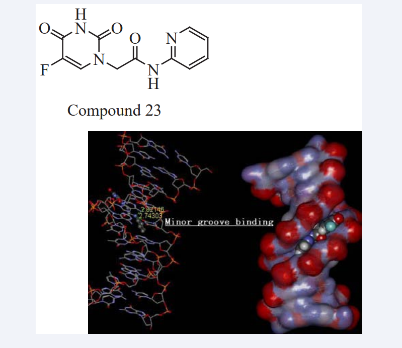 Da-An Qin et al have reported two derivatives of 5-fluorouracil (5-FU) were synthesized, and their electrochemical behavior with calf thymus-DNA (CT-DNA) were studied using cyclic voltammetry at a DNA-modified gold electrode. The variations in the cyclic voltametric behaviour of different concentrations of drugs with CT-DNA have investigated. MD was used to predict the modes of interactions of the drugs with DNA and results indicated that it can be considered as groove binding which binds to the minor groove of DNA double helix as shown in (Figure 21).