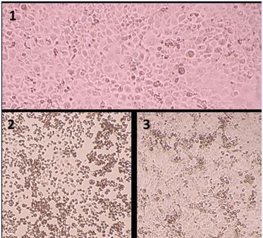 Figure 1 Images of cultures: (1) Uninfected Vero E6 cells; (2) CPE of titre -2 of a strain at 7 days; (3) CPE of titre -5 at 7 days.