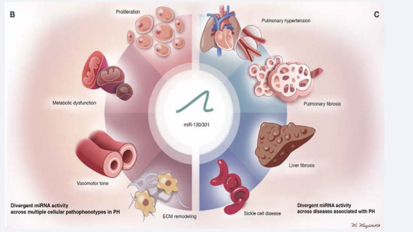Pulmonary hypertension [PH] is a complex disease characterized by pulmonary vascular dysfunction, right ventricular failure, and death. Exogenous injury [ inflammation, infection] and various other illnesses link to PH development, and gene mutations [BMPR2, etc.] predispose to hereditary forms of PH [39]. WHO categories PH into five main groups [40]. Therapy of PH are restricted to three classes of drugs that all affect pulmonary vasodilation [only pulmonary arterial hypertension and chronic thromboembolic PH] [41], prevent, or cure the disease. Attempts to identify the underlying pathobiology of this disease, as well as effective targets for the next generation of PH drugs, but only recently appreciated, class of molecules called noncoding RNAs [ncRNAs], of which the most widely studied class involves miRNAs. ncRNAs and miRNAs carry transcriptional and post transcriptional regulatory actions relevant to human health and disease, including PH (Figure 3). As our appreciation of the decisions of these molecules has advanced, our conception of the complexity of PH has also grown, often causing more confusion, particularly about the various actions of miRNAs.