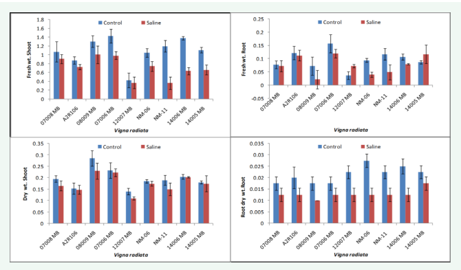 Figure 1: Shoot & root fresh, dry weight gplant-1 of nine Vigna radiata lines grown under control and various levels of salt (120 mM NaCl) in petri dishes.