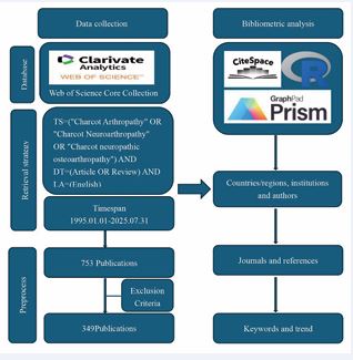 The Web of Science Core Collection database was selected for literature retrieval. The search query was formulated as follows: TS= (“Charcot Arthropathy” OR “Charcot Neuroarthropathy” OR “Charcot neuropathic osteoarthropathy”) AND DT= (Article OR Review) AND LA=(English). The search timeframe spanned from January 1, 1995, to July 31, 2025. Case reports, conference abstracts, editorial materials, and other non-article/ review document types were excluded. The initial search yielded 753 publications, from which 349 were ultimately included for analysis following screening. The detailed literature selection process is schematically illustrated in Figure 1.