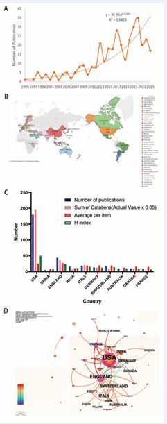 The annual number of publications serves as a key indicator of research activity. Analysis of the publication trend from 1995 to 2025 reveals a consistent, spiraling upward trajectory, reflecting a steady increase in research focus on Charcot Arthropathy (Figure 2A). A minor peak in annual output is observed in 2021-2022, with the highest number of publications (n=35) recorded in 2022.