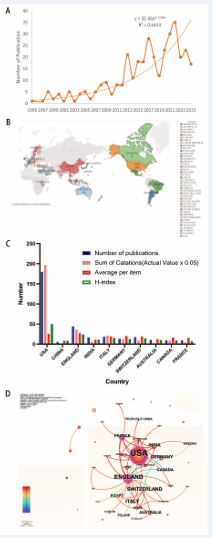 Analysis of publication output by country highlights the global distribution of research efforts. The United States leads with 180 publications, followed by the United Kingdom (44 publications) (Figure 2B). Publications from the United States also demonstrate superior academic influence, evidenced by the highest total citation count (3,949), alongside high average citations and H-index (Table 1, Figure 2C). Chronologically, the UK and US initiated research in this field earlier (1995 and 1998, respectively), while relevant publications from China first appeared in 2015. Larger circles indicate higher publication volumes, while connections between circles represent publication correlations among different countries—more connections signify stronger inter-country correlations. The collaboration network map (Figure 2D), indicates that research is predominantly concentrated in Western countries, with the United States serving as the central hub for international cooperation. Strong collaborative linkages are observed between the US, UK, and France, underscoring the role of international partnerships in advancing the field.