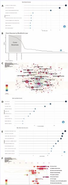 Figure 4 Analysis of Journal Sources and References. (A)Top 10 Journals by Publications. (B) Journals Analysis by Bradford’s Law. (C)Journal Co-citation Network Diagram. (D) Top 10 Journals by Citation Count. (E) Top 10 Articles by Citation Count. (F) Timeline of E Articles’ Total Citations.