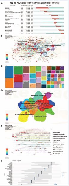 heightened research interest. Keyword co-occurrence network analysis demonstrates strong thematic correlations, with larger nodes representing higher frequency keywords and connecting lines indicating their co-occurrence within the literature (Figure 5B). The keyword tree dendrogram (Figure 5C), displays potential keyword combinations and their frequency proportions. Cluster analysis of keywords further delineates 11 distinct research themes, each represented by a uniquecolor in the network (Figure 5D). The evolution of these themes over time is visualized in the keyword timeline view (Figure 5E), which illustrates the emergence, duration, and interconnections of research topics. The keyword trend diagram (Figure 5F), synthesizes this information, indicating that keywords such as “FOOT,” “ARTHROPATHY,” and “NEUROARTHROPATHY” continue to define the central and evolving research fronts in this field.