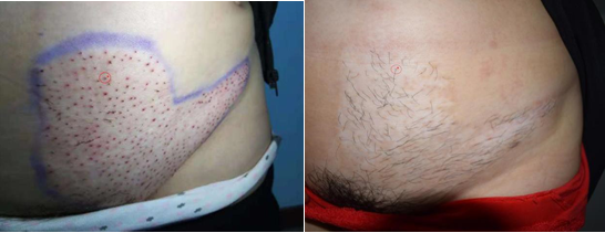 Through clinical studies, our team found evidence that McSC in the hair follicles of single hair follicle transplantation for vitiligo cannot enter the epidermis: Evidence 1: Scalp vitiligo is the most common vitiligo in clinical practice, and the scalp of vitiligo patients turns white first, and then the hair turns white. This clinical phenomenon illustrates that scalp vitiligo does not occur if McSCs in a single hair follicle can enter the epidermis. In scalp vitiligo, vitiligo is still formed at follicle densities of up to 100 plants/cm2, indicating that McSCs in hair follicles are unable to enter the vitiligo-affected area (Figure 1). Similarly, vitiligo in long hairy areas such as eyebrows, eyelashes, beard, and vulva also indicates that McSCs in hair follicles cannot enter the vitiligo-affected area. Evidence 2, “When 21 vitiligo patients in the Na study were treated with single hair follicle transplantation, the lower 1/3 of the hair follicle should be removed before hair follicle implantation for patients with smooth skin. After surgery, the MC in the hair of 15 patients began to migrate to the epidermis within 2-8 weeks, and the pigment around the transplanted hair follicles began to regenerate and expand to 2-10 mm in diameter within 1 year.” Doctors who are engaged in hair transplantation know that the hair follicles are immediately inactivated after removing 1/3 of the hair follicles, and it is nonsense that the McSCs in the inactivated hair follicles enter the affected vitiligo; The punctate pattern formed by the scalp MC is exactly the same as the effect of punctate epidermal grafting. According to 3, clinical studies have found that the affected area of vitiligo does not produce punctate discoloration after removing the epidermis above the hair follicle funnel, which further confirms that the melanocytes in the hair follicle cannot enter the epidermis after removing the scalp around the hair follicle of a single plant. In summary, the essence of single hair follicle transplantation in the treatment of vitiligo is to transplant MC from the scalp (Figure 2).