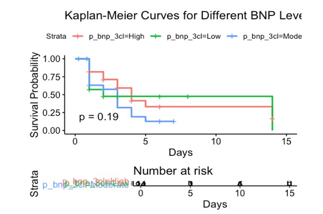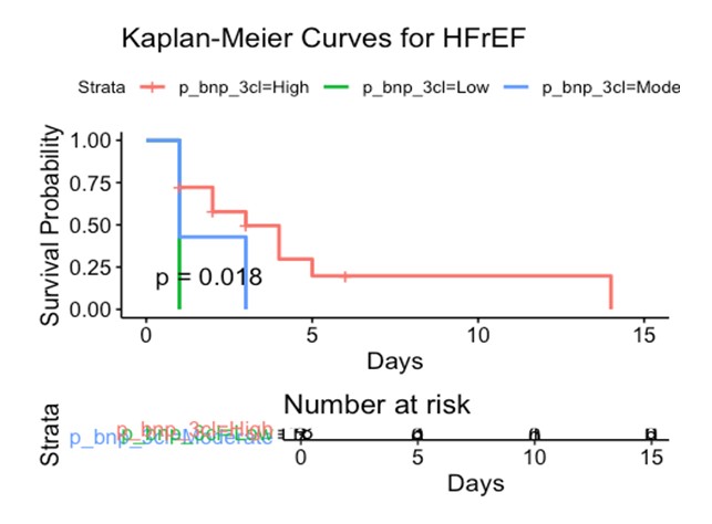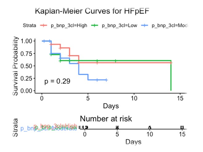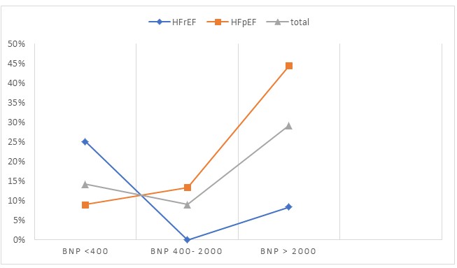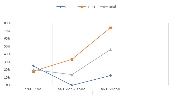 HFpEF Cohort: Patients in the HFpEF cohort were categorized into three sub-cohorts according to BNP values. In all three sub-cohorts of the HFpEF cohort, the majority of patients were male, and most had a Rockwood Clinical Frailty Scale score of 6. The majority of patients presented with shortness of breath, and a minority had evidence of fluid overload. Those with moderately and highly elevated BNP had other associated vascular risk factors, including coronary artery disease, hypertension, CKD, CVA, and AF, as seen in (Table 1).