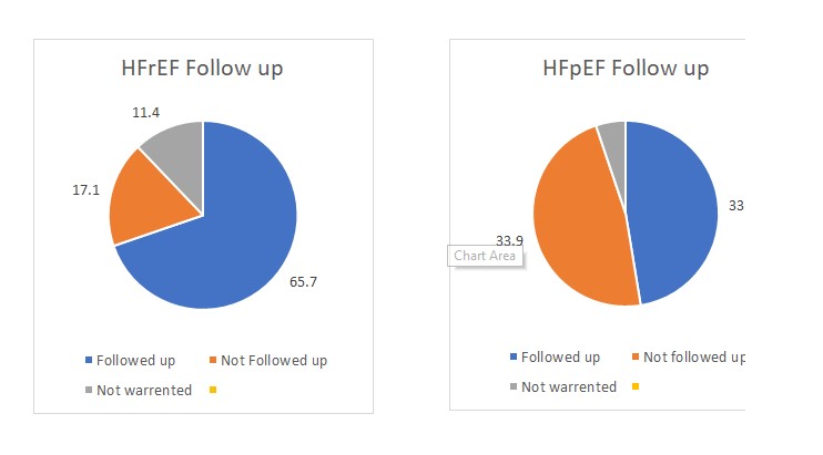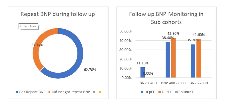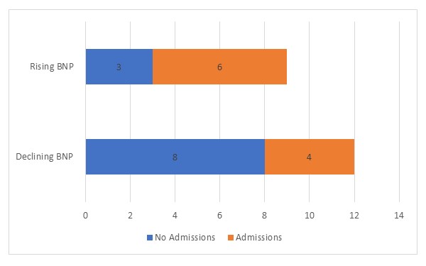 The same cohorts were further followed up for 12-15 weeks to monitor the two above-mentioned end points. In addition, whether patients received outpatient heart failure follow-up (e.g., with heart failure nurse, cardiac hub, or cardiology specialist) was also monitored. Repeat BNP values during follow-ups were compared with each patient’s initial BNP value and documented as either a “reduction” or “increase.” These parameters were again correlated with the aforementioned end points.