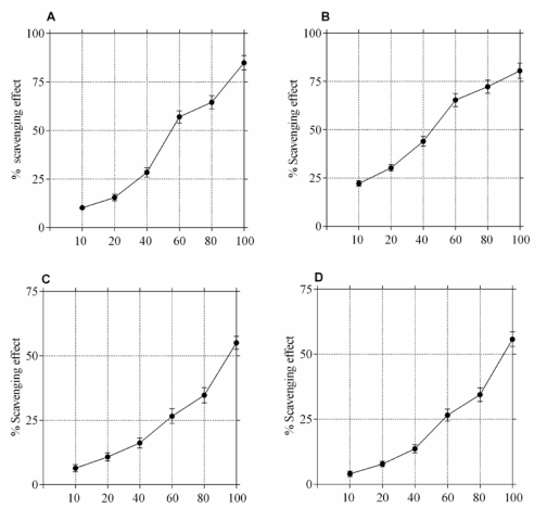Figure 2: DPPH radical scavenging activities (%) of various solvent extract of aerial parts of H. helix. [A] crude extract, [B] chloroform fraction, [C] ethyl acetate fraction, and [D] aqueous fraction. Data are shown as mean of three different experiments