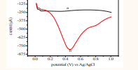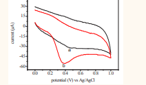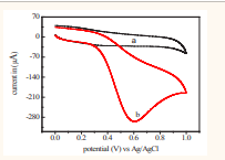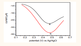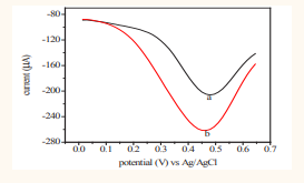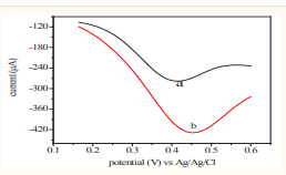shows (a) the cyclic voltammograms for phosphate buffer and (b) the oxidation of 8 mM ascorbic acid in 0.1 M phosphate buffer supporting electrolyte at pH = 3. The buffer solution gave no response while anodic peak current was observed at 596 mV in the voltammogram of the ascorbic acid solution. No cathodic peak current was found indicating an irreversible heterogeneous charge transfer due to the absence of electro activity on the reverse scan during cyclic voltammetry [30].